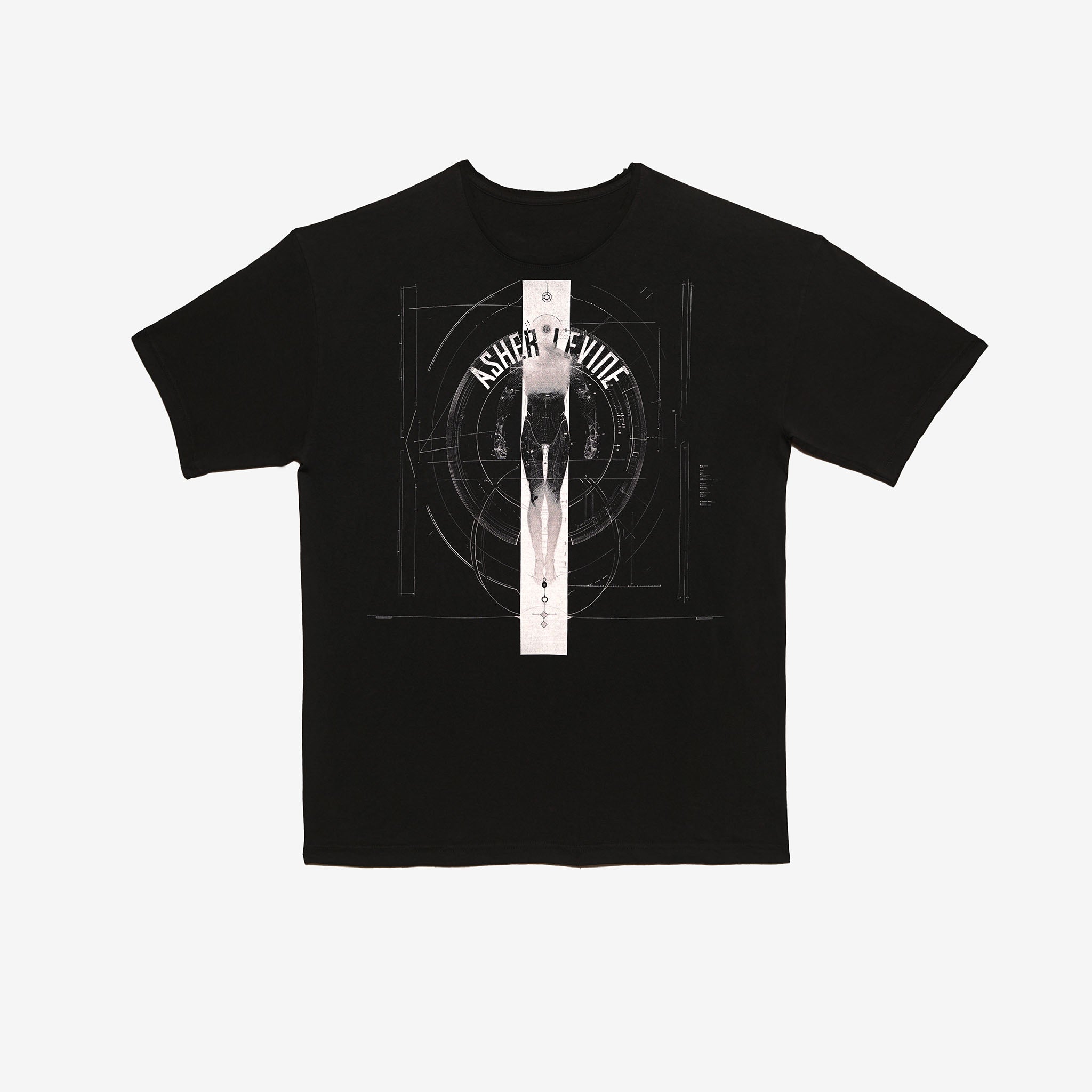 This t-shirt is crafted in Los Angeles and post-garment dyed for a soft distressed feel. The central artwork, framed by geometric lines and circular patterns, evokes themes of human evolution and cosmic symmetry. The Asher Levine logo is seamlessly integrated into the design, enhancing its conceptual and minimalist appeal, and finished with a 3D diamond emblem, and a raw ribbed neckline.
